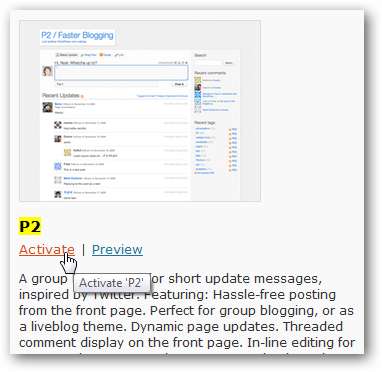 Kliknij Aktywuj pod nagłówkiem P2, aby natychmiast rozpocząć korzystanie z P2 na swoim blogu. To wszystko; bardzo łatwo jest zacząć korzystać z P2 na blogach WordPress.com.
