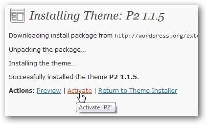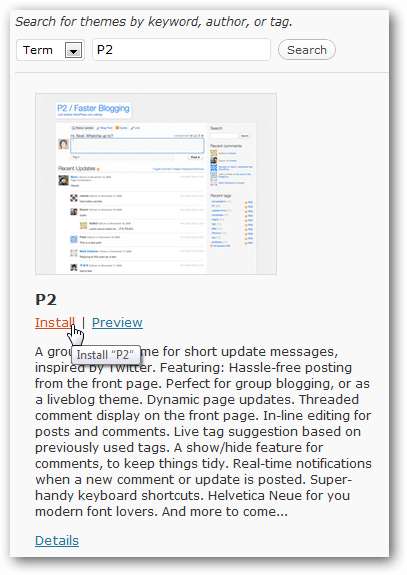 Najłatwiejszym sposobem zainstalowania P2 jest po prostu wyszukanie go w polu wyszukiwania. Po załadowaniu wyników kliknij zainstalować pod obrazem podglądu P2, aby zainstalować go bezpośrednio na swoim blogu.