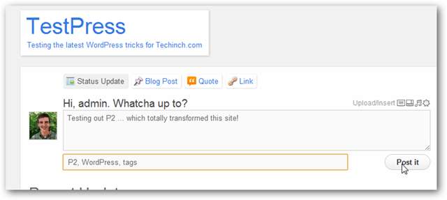Istnieją oddzielne opcje postów dla aktualizacji statusu, postów na blogu, cytatów i linków. Możesz także przesyłać i wstawiać zdjęcia, filmy i nie tylko bezpośrednio do postów P2. To sprawia, że bardzo szybko możesz opublikować prawie wszystko na swoim blogu, chociaż ponownie P2 jest najlepszy do krótkich notatek i aktualizacji.