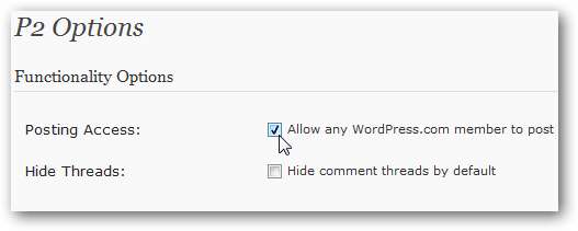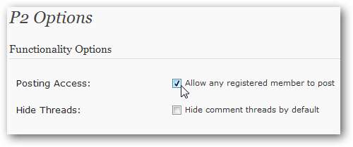 W witrynach hostowanych samodzielnie P2 umożliwia każdemu zarejestrowanemu członkowi wysyłanie postów. To świetna opcja, jeśli używasz P2 jako forum pomocy technicznej lub podobnej witryny albo jeśli chcesz ustawić swój blog jako prywatny, jak opisano poniżej.