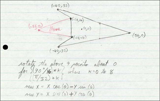 „Liczby oznaczają współrzędne wektora generatora”, mówi Logg. „W praktyce, chciałbym wydać polecenie, aby przejść do określonego miejsca na ekranie, gdzie chcę, aby narysować statek, a następnie wykorzystać te współrzędne, aby przejść do rogu, włącz belki i narysuj statku z jednego punktu do następnego , Jeśli płomień był obecny, chciałbym zwrócić że też.”