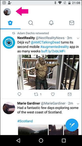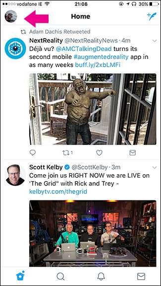 Otwórz aplikację Twittera na swoim smartfonie i kliknij swoje zdjęcie profilowe w lewym górnym rogu, aby otworzyć menu.