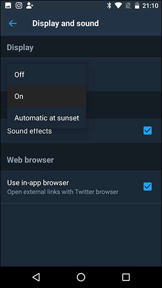 W Androidzie istnieje opcja automatycznego włączania trybu ciemnego o zachodzie słońca. Wybierz kolejno opcje Ustawienia i prywatność> Wyświetlanie i dźwięk, a następnie w opcji Tryb nocny wybierz opcję Automatycznie o zachodzie słońca.