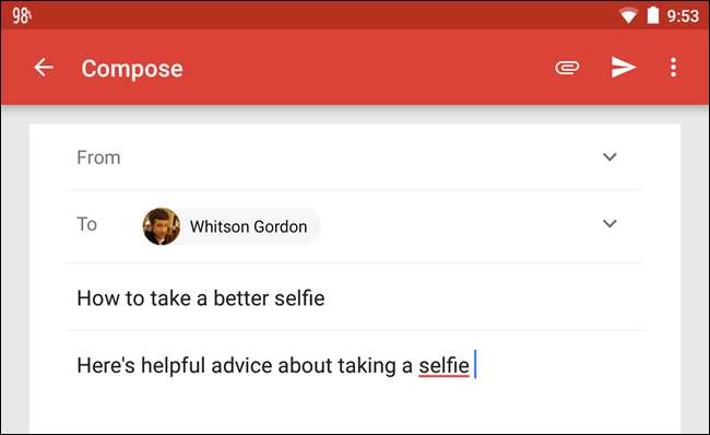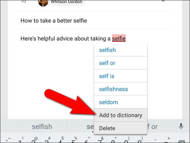 Najłatwiejszym sposobem dodania słowa do słownika jest użycie klawiatury. Powiedzmy, że piszesz e-maila w aplikacji Gmail. Wpisujesz słowo, którego nie ma w słowniku, a po wpisaniu spacji zostanie podkreślone na czerwono, jak pokazano poniżej.