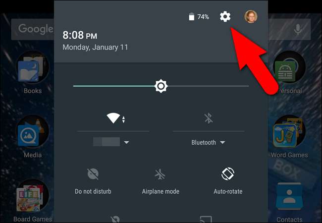 Następnie ponownie przesuń w dół w centrum powiadomień, aby uzyskać dostęp do ekranu „Szybkie ustawienia”. Kliknij ikonę „Ustawienia” w prawym górnym rogu.