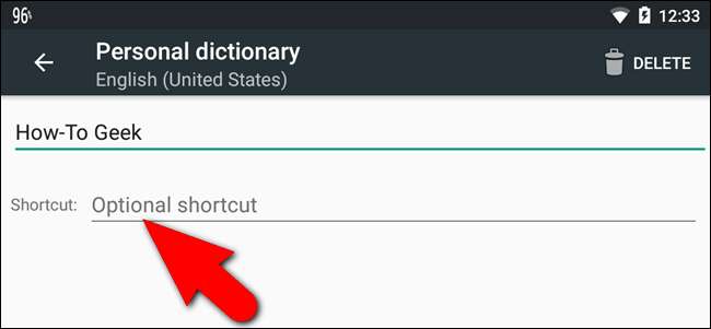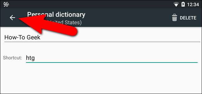 Wpisz swój skrót. Na przykład, chcemy mieć możliwość wpisania „htg” za każdym razem, gdy chcemy wprowadzić „How-To Geek”, więc jako skrót wprowadziliśmy „htg”. Dotknij strzałki wstecz, aby zaakceptować zmiany i powrócić do poprzedniego ekranu.