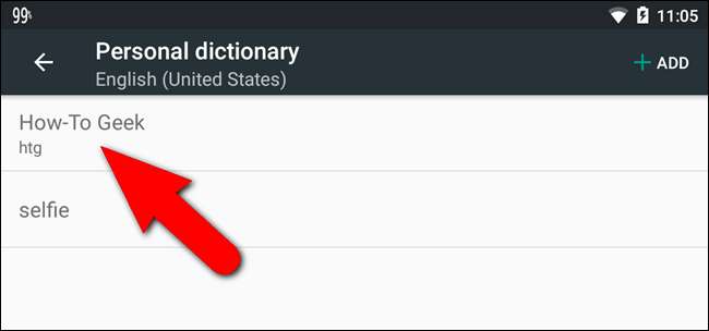 Jeśli chcesz usunąć słowo lub frazę ze „Słownika osobistego”, dotknij słowa lub frazy na tej liście i dotknij „Usuń” w prawym górnym rogu ekranu, jak pokazano powyżej. Nawet jeśli usuniesz słowo lub frazę ze „Słownika osobistego”, Google nadal nauczył się tego słowa i zasugeruje je na pasku autokorekty u góry klawiatury Google, gdy zaczniesz je wpisywać. Wydaje się, że nie ma sposobu, aby zapobiec sugerowaniu słów, gdy Google je nauczy.