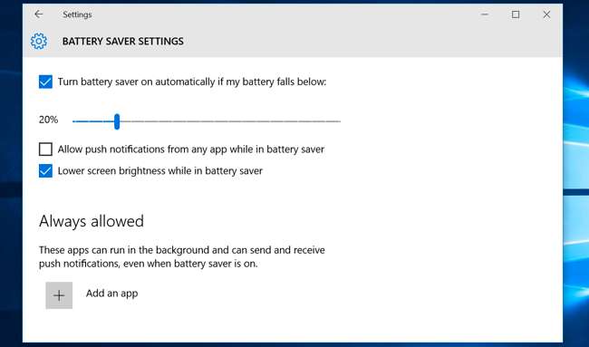 Upewnij się, że opcja „Zmniejsz jasność ekranu podczas oszczędzania baterii” jest włączona, a następnie wybierz procent, od którego ma się włączać Oszczędzanie baterii. Gdy Oszczędzanie baterii aktywuje się na tym poziomie, zmniejszy to podświetlenie i oszczędza energię. Domyślnie Oszczędzanie baterii włącza się, gdy pozostało 20% baterii.