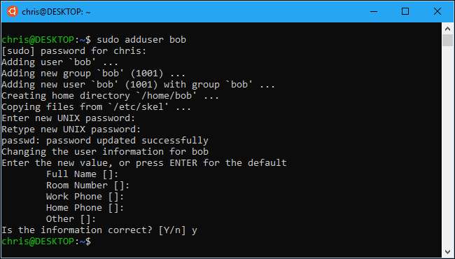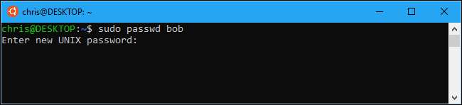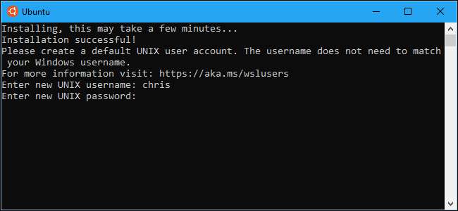 Kiedy konfigurujesz nową dystrybucję Linuksa, uruchamiając ją po zainstalowaniu, pojawi się prośba o utworzenie konta użytkownika dla powłoki Bash. Windows nazywa to „kontem użytkownika UNIX”. Tak więc, jeśli podasz nazwę „bob” i hasło „letmein”, twoje konto użytkownika Linuksa zostanie nazwane „bob” i będzie zawierało folder domowy „/ home / bob”. Kiedy musisz wprowadzić swoje hasło w powłoce, musisz wpisać „letmein”. Te poświadczenia są całkowicie niezależne od konta użytkownika i hasła systemu Windows.