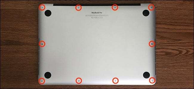 Ten krok jest prawie taki sam dla każdego nowoczesnego MacBooka, z wyjątkiem nowszych modeli paska dotykowego (więcej na ten temat poniżej). Odwróć MacBooka tak, aby spód był skierowany do góry. Weź śrubokręt pentalobe P5 i odkręć śruby na obwodzie MacBooka. Śledź każdą śrubę i dokąd idzie, ponieważ niektóre z nich mają różne długości .