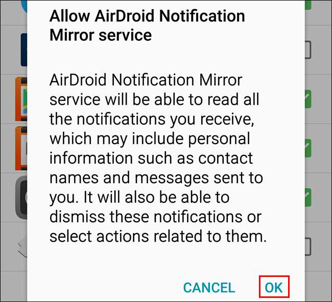 W polu „AirDroid Notification Mirror Service” powinien znajdować się znacznik wyboru wskazujący, że usługa jest włączona. Naciśnij przycisk „Wstecz” na urządzeniu, aby powrócić do aplikacji AirDroid.