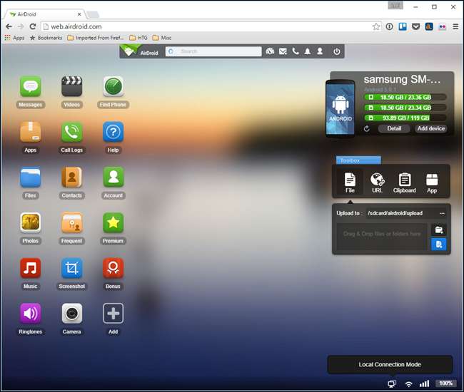 Po nawiązaniu połączenia zobaczysz stronę główną AirDroid, która zawiera linki i statystyki dotyczące Twojego urządzenia. W prawym dolnym rogu zobaczysz siłę połączenia Wi-Fi, paski zasięgu sieci komórkowej i poziom naładowania baterii urządzenia z Androidem.