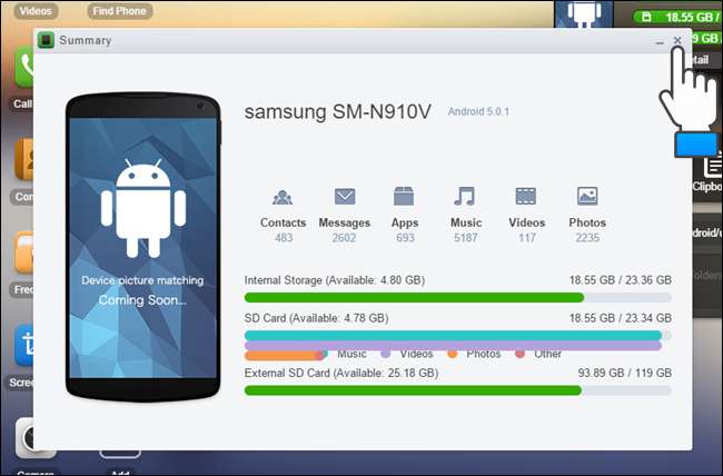 Użyj przycisku „Prześlij”, aby dodać pliki do urządzenia bezprzewodowo, bez podnoszenia tego kabla USB. Kliknij przycisk „X” w prawym górnym rogu okna dialogowego, aby je zamknąć. To samo w oknie dialogowym Pliki.