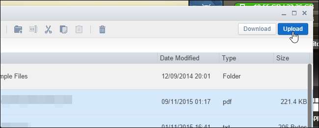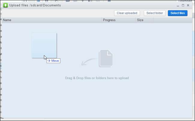 Zostanie wyświetlone okno dialogowe „Prześlij pliki”. Przeciągnij i upuść pliki z komputera do tego okna dialogowego, aby przesłać je do urządzenia. Pliki są zapisywane w dowolnym katalogu, który był otwarty podczas otwierania okna dialogowego „Prześlij pliki”. Kliknij przycisk „X” w prawym górnym rogu okna dialogowego „Prześlij pliki”, aby je zamknąć, a następnie w oknie dialogowym „Pliki”, aby zamknąć to okno.