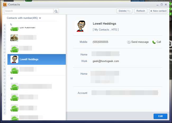 Panel „Kontakty” umożliwia przeglądanie kontaktów Androida i wykonywanie na nich czynności, takich jak „Wyślij wiadomość” lub „Zadzwoń”. Możesz także edytować swoje kontakty w telefonie za pomocą przeglądarki.