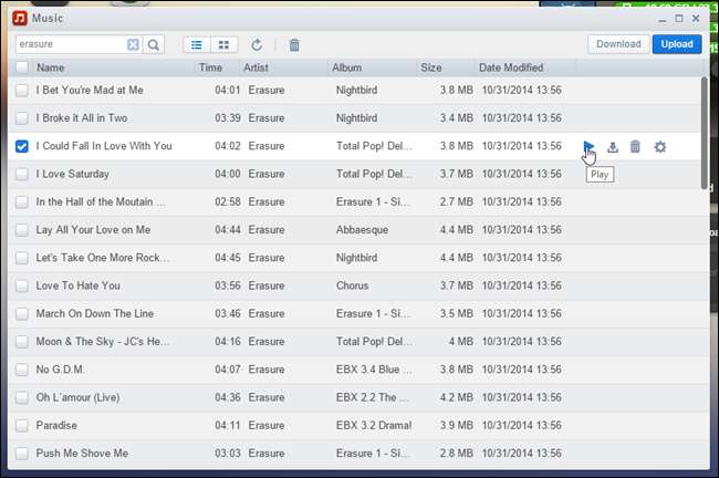 Panel „Muzyka” umożliwia używanie urządzenia z systemem Android jako szafy grającej. Wyszukaj muzykę na swoim urządzeniu i odtwórz ją. Te same opcje „Prześlij” i „Pobierz”, które są dostępne przy przesyłaniu plików, są również dostępne w panelu „Muzyka” i umożliwiają przesyłanie plików muzycznych do iz urządzenia.