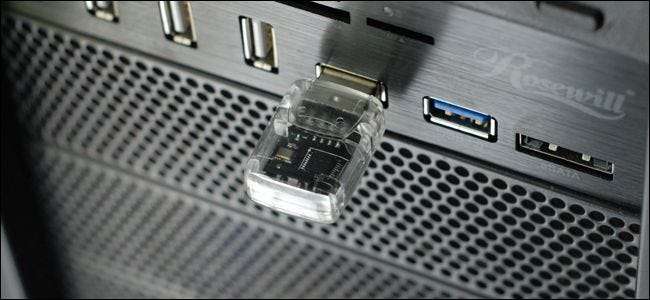Po pierwsze, potrzebujesz odbiornika podczerwieni USB do komputera multimedialnego. Zalecamy FLIRC , choć jakieś ogólny odbiornik USB prawdopodobnie zadziała. Podłącz odbiornik do centrum multimedialnego i upewnij się, że znajduje się on w zasięgu Twojej pozycji siedzącej, abyś mógł skierować pilota w jego ogólnym kierunku.
