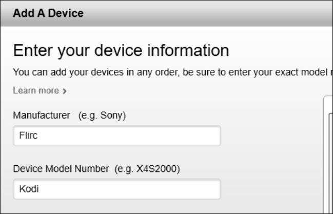 Przejdź do zakładki „Urządzenia” i kliknij przycisk „Dodaj urządzenie”. Jeśli używasz FLIRC, wprowadź „Flirc” jako producenta i nazwę programu centrum multimedialnego jako numer modelu (np. „Kodi” lub „Plex”). Automatycznie zaimportuje funkcje do programu Media Center.