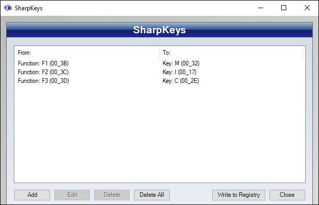 Aby to zrobić, zalecam użycie programu o nazwie SharpKeys w systemie Windows. Wystarczy pobrać program i uruchomić go (jest przenośny, nie wymaga instalacji). Kliknij przycisk Dodaj, wybierz klucz, który chcesz zmapować od na lewym pasku bocznym i klawisz, który chcesz zmapować do na prawym pasku bocznym. Na przykład zmapowałem klawisz „F1” do „M”, a następnie przypisano „F1” do przycisku „Menu” na moim pilocie w MyHarmony.