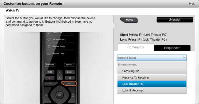 Jeśli używasz FLIRC, możesz przypisać funkcje swojego centrum multimedialnego w MyHarmony do przycisków na pilocie. Większość z nich powinna działać bez problemu. Ale jeśli brakuje jakichś funkcji, po prostu przypisz losową funkcję do przycisku w MyHarmony użyj oprogramowania FLIRC, aby „nauczyć się” tego przycisku na pilocie. Po prostu nie zostawiaj przycisku „nieprzypisanego” w MyHarmony lub nie wyśle on żadnego sygnału do FLIRC podczas programowania.