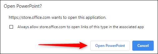 Pojawi się kolejny komunikat, tym razem żądając pozwolenia na otwarcie PowerPoint. Kliknij "Otwórz PowerPoint".