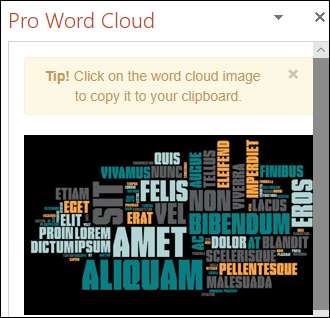 Chmura Pro Word będzie teraz generuje Twoją chmurę słów. Jak widać z wyświetlanej wskazówki, obraz chmura słowa jest kopiowany do schowka.