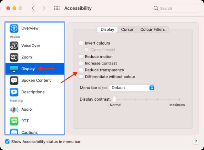 Teraz, z paska bocznego wybierz opcję "Wyświetl", a następnie włączyć funkcję "Zmniejszyć przezroczystość".