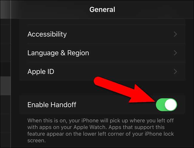 Na ekranie „Ogólne” dotknij suwaka „Włącz Handoff”, aby włączyć tę funkcję. Po włączeniu przycisk zmienia kolor na zielony.