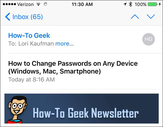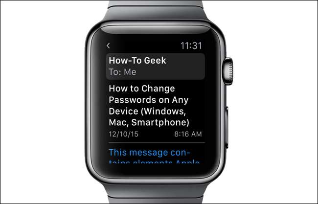Możesz zostać poproszony o wprowadzenie kodu dostępu, aby uzyskać dostęp do telefonu, ale po zalogowaniu się e-mail, który czytałeś na zegarku, wyświetla się na ekranie iPhone'a.