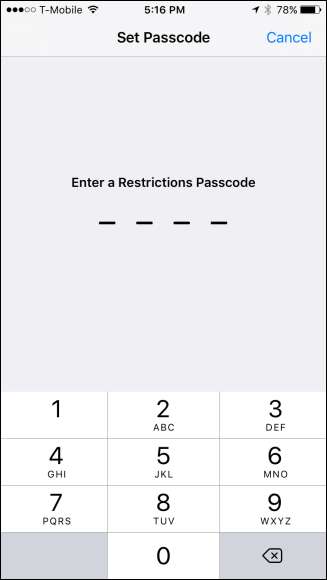 Następnie ustaw 4-cyfrowy kod dostępu, aby włączyć ograniczenia. Upewnij się, że jest to coś, czego Twoje dzieci nie mogą łatwo odgadnąć!