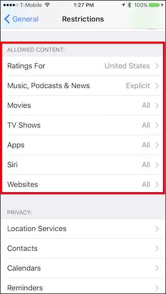 Przewijając w dół, znajdziesz sekcję Dozwolone treści, która będzie bardzo interesująca dla wielu rodziców. W sumie istnieje siedem kategorii, według których możesz ograniczyć dostęp do treści.