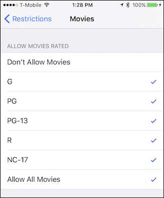 - Ograniczać : Pozwala to ograniczyć filmy, programy telewizyjne, aplikacje, muzykę i książki do określonej oceny lub zabronić treści zawierających wulgarne treści. Alternatywnie możesz po prostu zabronić całej zawartości w dowolnej kategorii.