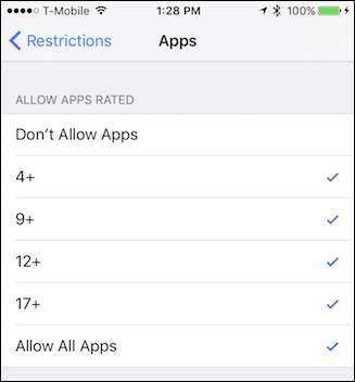 Wreszcie sekcja „Aplikacje” pozwala ograniczyć dostęp do najwyższego poziomu wiekowego, na jaki chcesz zezwolić, lub po prostu zezwolić lub zabronić wszystkim aplikacjom.
