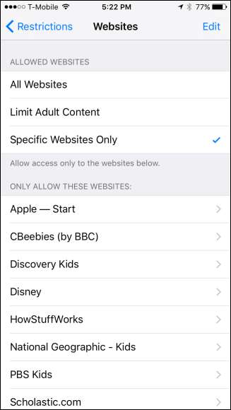 „Witryny internetowe” umożliwiają filtrowanie witryn według treści dla dorosłych, tylko do określonych (przyjaznych dzieciom) witryn lub wcale.
