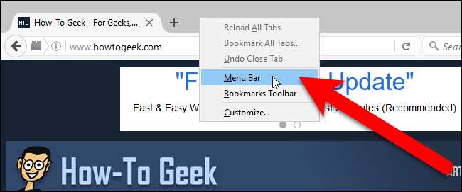 Istnieją dwa sposoby przeglądania offline w przeglądarce Firefox. Pierwsza metoda wykorzystuje pasek menu, który jest teraz domyślnie ukryty w przeglądarce Firefox. Aby tymczasowo wyświetlić pasek menu, naciśnij „Alt” na klawiaturze. Menu jest wyświetlane wystarczająco długo, aby można było wybrać polecenie, a następnie ponownie się ukrywa. Jeśli chcesz, aby pasek menu był wyświetlany przez cały czas, kliknij prawym przyciskiem myszy pusty obszar na pasku kart i wybierz „Pasek menu” z menu podręcznego.