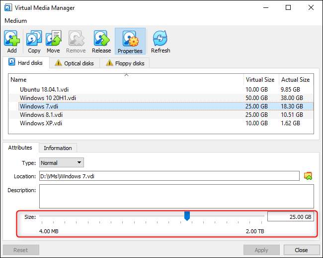 Wybierz wirtualny dysk twardy z listy i użyj suwaka „Rozmiar” u dołu okna, aby zmienić jego rozmiar. Po zakończeniu kliknij „Zastosuj”.