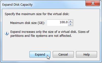 Wprowadź większy maksymalny rozmiar dysku i kliknij przycisk Rozwiń. VMware zwiększy rozmiar dysku wirtualnego, chociaż jego partycje pozostaną tego samego rozmiaru - zobacz poniżej, aby uzyskać informacje na temat powiększania partycji.