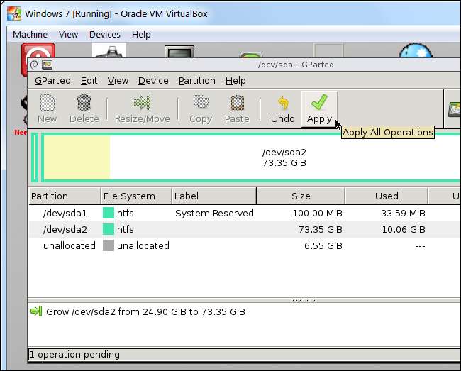 Będziesz teraz musiał rozszerzyć partycję systemu operacyjnego gościa, tak jakbyś powiększał partycję na prawdziwym dysku twardym komputera fizycznego. Nie można powiększyć partycji, gdy działa system operacyjny gościa, tak samo jak nie można powiększyć partycji C: \, gdy na komputerze jest uruchomiony system Windows.