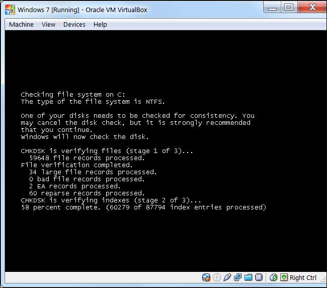Po zakończeniu operacji zmiany rozmiaru uruchom ponownie maszynę wirtualną i usuń plik ISO GParted. System Windows sprawdzi system plików na maszynie wirtualnej, aby upewnić się, że działa poprawnie - nie przerywaj tego sprawdzania.