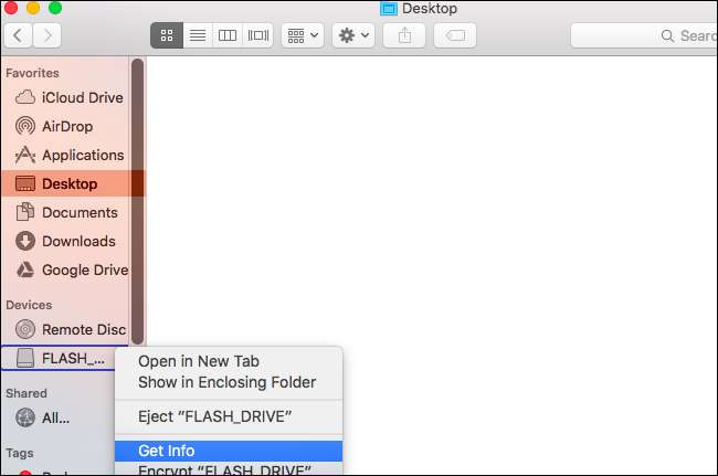 Więc skąd wiesz, czy twój dysk USB jest używając odpowiedniego formatu ? Nie musisz robić nic specjalnego z Narzędziem dyskowym - po prostu podłącz dysk USB i otwórz Finder. Kliknij prawym przyciskiem myszy lub kliknij z naciśniętym klawiszem Control ikonę dysku na pasku bocznym Findera (lub na pulpicie) i wybierz „Uzyskaj informacje”.