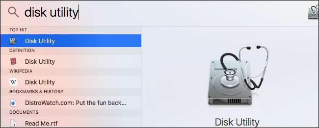 Aby sformatować dysk na komputerze Mac, potrzebujesz wbudowanej aplikacji Disk Utility. Naciśnij klawisze Command + Spacja, aby otworzyć okno dialogowe wyszukiwania Spotlight, wpisz „Narzędzie dyskowe” i naciśnij „Enter”, aby uruchomić aplikację.