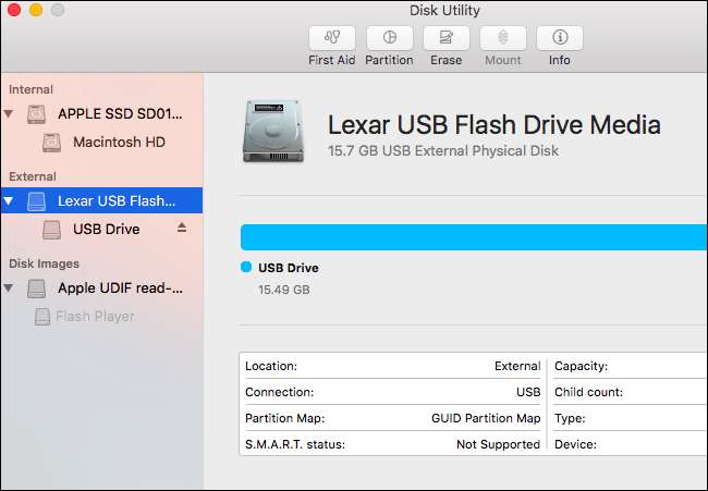 Podłączone dyski pojawią się w sekcji „Zewnętrzne” na pasku bocznym Narzędzia dyskowego. Wybierz dysk, klikając jego nazwę.