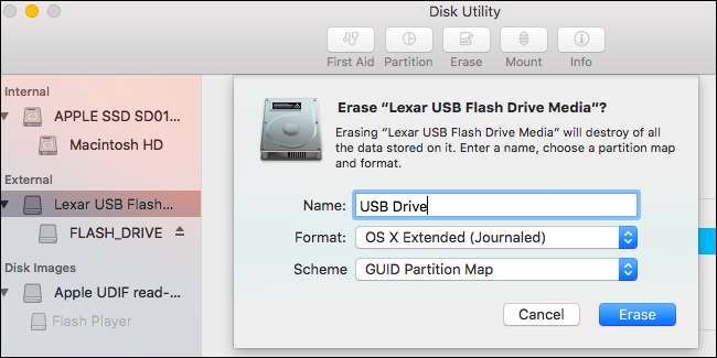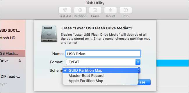 Zostaniesz również poproszony o wybranie schematu partycji: Mapa partycji GUID, Główny rekord rozruchowy lub Mapa partycji Apple. GPT jest nowocześniejszy, a MBR jest starszy . Oba działają również z komputerami z systemem Windows. APM to starszy schemat partycji tylko dla komputerów Mac.
