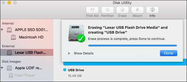 Gotowe - pamiętaj, aby wysunąć dysk przed wyjęciem go z komputera Mac. Możesz to zrobić, klikając ikonę wysuwania po prawej stronie dysku w oknach Findera lub Narzędzia dyskowego.