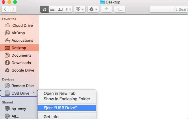 Możesz także kliknąć napęd prawym przyciskiem myszy lub kliknąć z klawiszem Option w Finderze lub na pulpicie i wybrać opcję „Wysuń”.