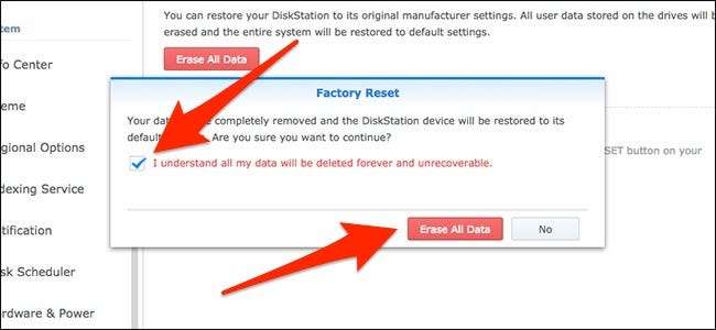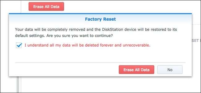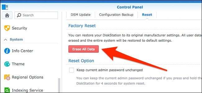Jeśli chcesz wybrać bardziej ekstremalną trasę, możesz całkowicie zresetować wszystko, w tym wyczyścić wszystkie dane z dysków twardych. Jest to również nieco łatwiejsze do zrobienia, ponieważ możesz to zrobić bezpośrednio z DSM, zamiast zajmować się fizycznym przyciskiem resetowania na urządzeniu. Zanim jednak zaczniesz, dobrym pomysłem może być najpierw wykonaj kopię zapasową wszystkiego .