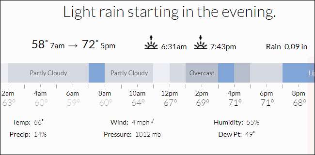 Zamiast kilku ikon z informacjami o średniej pogodzie każdego dnia zobaczysz prognozę na następną godzinę, następne 24 godziny i następny tydzień. Możesz przejść do szczegółów i spojrzeć na każdy dzień tygodnia, aby zobaczyć prognozowane opady, a następnie kliknąć, aby zobaczyć dokładnie, kiedy w prognozie będzie padać deszcz.