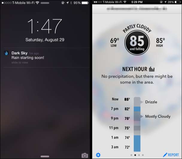 Dark Sky to płatna aplikacja (3,99 USD), ale jest też prawdopodobnie jedną z najlepszych mobilnych aplikacji pogodowych. Oferują aplikacje na Androida i iOS (a nawet obsługują Apple Watch). Dark Sky oferuje wszystkie te same informacje, co strona darksky.net, ale z ładnym, przyjaznym dla urządzeń mobilnych interfejsem i wieloma konfigurowalnymi powiadomieniami pogodowymi.