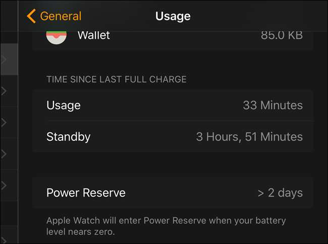 U dołu listy aplikacji znajduje się czas „użycia” i czas „czuwania” od ostatniego pełnego naładowania. Ponadto kwota „ Rezerwa mocy ”.