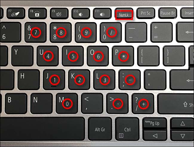 Oto przykład klawiatury firmy Acer do laptopa z systemem Windows 10. Po naciśnięciu klawisza Num Lock (tutaj podświetlonego na czerwono), 15 klawiszy przełącza tryby w symulowaną klawiaturę numeryczną. Kiedy je popchniesz, zarejestrują się jako podświetlony symbol w czerwonym kółku.